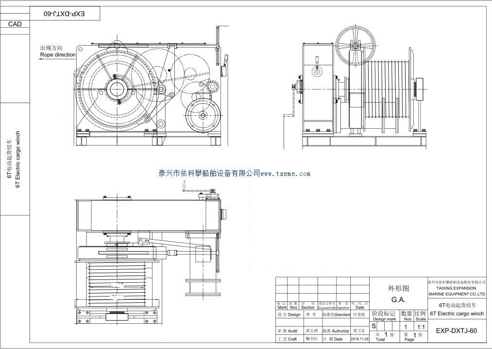 6T自動起貨提升絞車 技術規格: 圈筒載荷:60kN(1st Layer) 額外的波特率:≧6m/min 另外電動機扭矩:120kN 鋼條繩半徑:Φ30mm 鋼條繩發熱量:50m